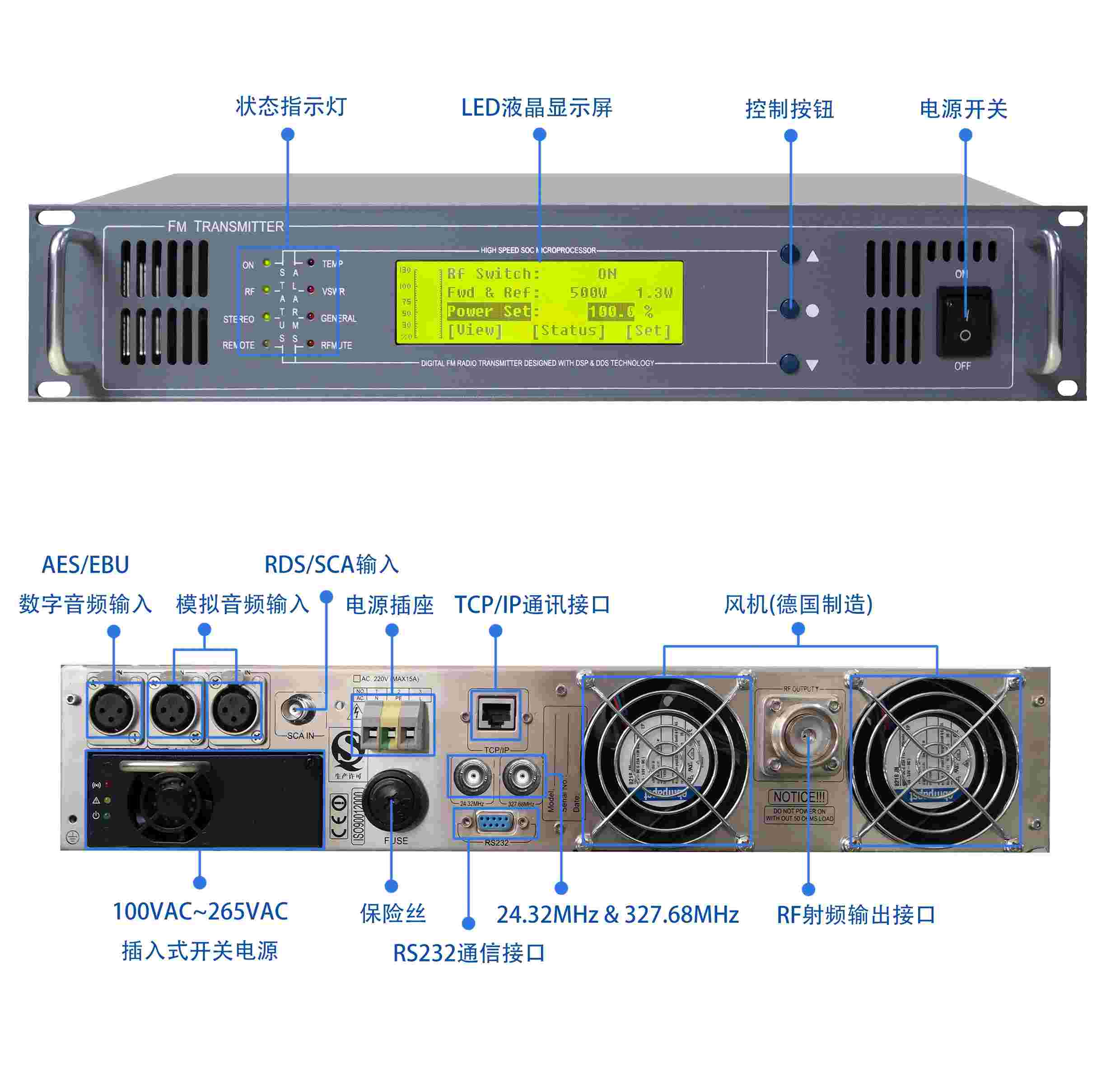 ??? 采用最新DSP+DDS全數(shù)字化技術(shù)的立體聲調(diào)頻激勵(lì)器,整機(jī)的各項(xiàng)技術(shù)指標(biāo)無與倫比,達(dá)到接近CD音質(zhì)聽覺效果。采用大尺寸散熱器和2只德國(guó)原裝高速、長(zhǎng)壽命風(fēng)扇、確保發(fā)射機(jī)工作在可靠的低溫狀態(tài)。采用臺(tái)灣原裝明緯寬范圍開關(guān)電源。高可靠性、高性能、操作簡(jiǎn)便、價(jià)格低廉。